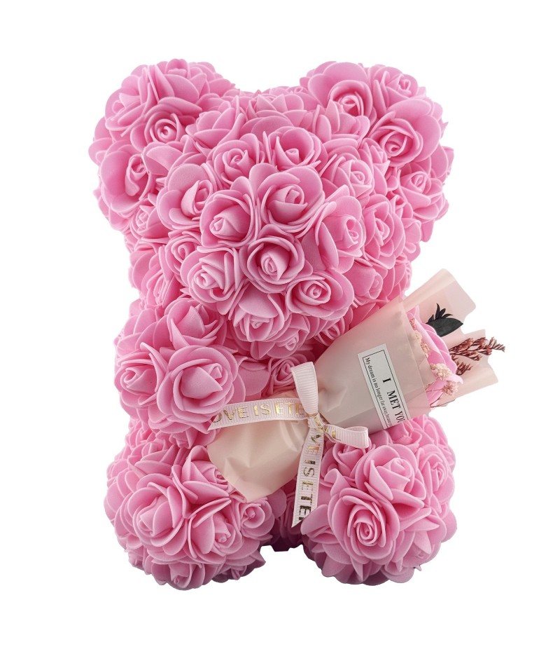 Trandafirii din spuma sunt rezistenti si isi pastreaza forma si culoarea in timp, oferind un aspect placut si decorativ. Ursuletul este livrat intr-o cutie transparenta, care il protejeaza si ii ofera un plus de rafinament, fiind gata de oferit cadou.