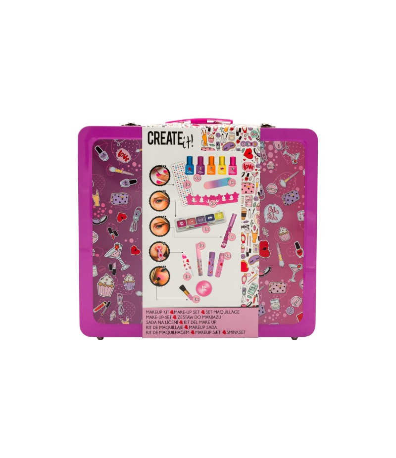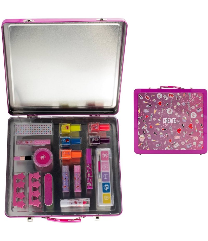 Setul conține: lacuri de unghii (5 x 8 ml), balsam buze (2 x 3,5 g), fard de pleoape cremos (1 x 5 g), luciu buze (1 x 1,2 g), luciu buze (1 x 3,5 g), mascara (1 x 2 ml), fard obraz (1 x 2,2 g), 1 set stickere, 1 pilă unghii, 1 set separatoare unghii pentru pedichiură, 1 pensulă pentru blush. Dimensiunea ambalajului: 31 x 27 x 4 cm. Vârsta recomandată + 6 ani. Mod de utilizare: Luciu buze/Balsam buze: Aplicați o cantitate moderată de produs pe buze și distribuiți uniform. Lac de unghii: Agitați bine sticluța înainte de utilizare, apoi aplicați unul/două straturi de lac unghii. Fard pleoape/obraz: Se aplică fard pleoape/obraz, folosind o pensulă pentru farduri de ochi/obraz. Îndepărtați machiajul cu demachiant. Îndepărtați oja cu un produs de îndepărtare a lacului de unghii. Vârsta recomandată + 6 ani.