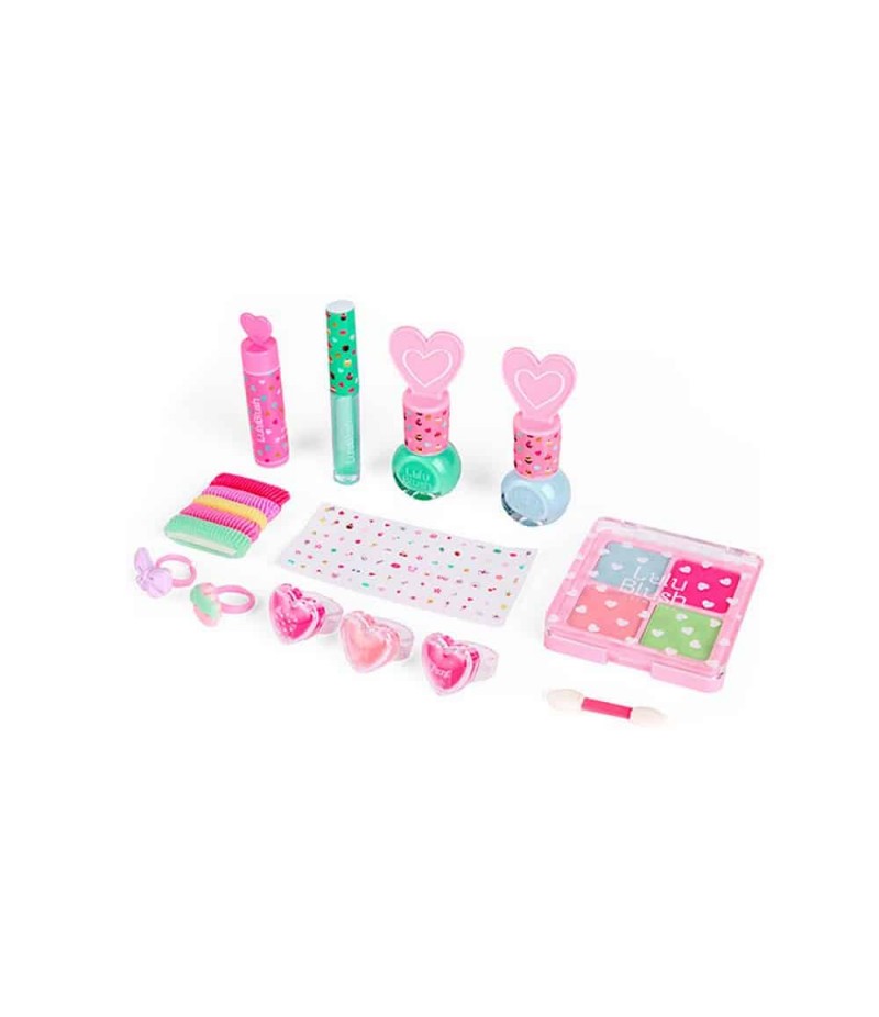 Setul conține: lac de unghii(2 × 5 ml ), luciu buze aromă măr (1 × 1,2 ml), balsam buze aromă zmeură (1 × 4 g), fard pleoape (4 nuanţe × 1,7 g), inele cu balsam buze (2 × 0,6 g), balsam buze căpşuni & bubble-gum (2 × 0,6 g), 2 inele decorative, 4 elastice păr, 1 aplicator fard, stickere. Mod de utilizare: Lac de unghii: agitați bine sticluța înainte de utilizare,ulterior aplicați unul sau două straturi de lac de unghii. Îndepărtați oja cu apă și săpun. Luciu buze/Balsam buze: aplicați o cantitate moderată de produs pe buze și distribuiți uniform. Fard de pleoape: se aplică pe pleoape, folosind o pensulă pentru farduri de ochi. Îndepărtați machiajul cu demachiant. Vârsta recomandată + 3 ani.