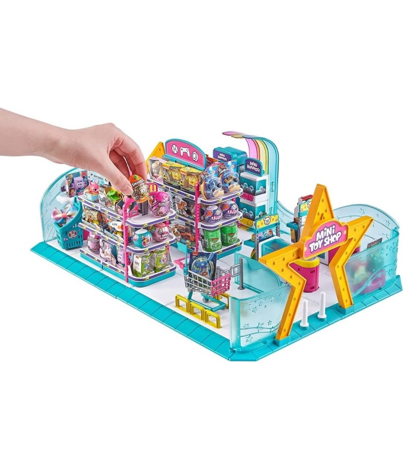 77152 - 5 Surprise, Mini magazin pentru jucari Toy Mini Brands S3. Contine: 5 mini jucarii surpriza, 1 baza, 1 perete, 1 statie de joaca cu display, 1 jucarie intare magazin, 6 rafturi, 2 conectoare pentru rafturi, 2 case de marcat, 1 bagaj, 1 cos cu roti, 1 masina cu gheare, 2 recipienti pentru capsule, 1 set de autocolante, 1 manual cu instructiuni, 1 ghidul colectionarului.