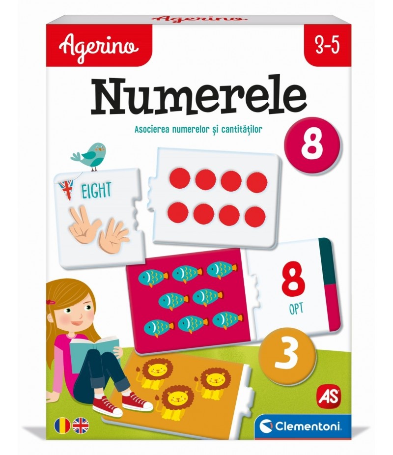 Jocul lui Agerino "Numerele" familiarizeaza copilul cu conceptele de baza ale aritmeticii. Prin exercitii simple de combinare, imagini vesele si colorate, acesta învata semnificatia si valoarea numerelor si a cantitatilor. În acelasi timp, jocul dezvolta spiritul de observatie, logica, sociabilitatea, memoria, creativitatea, fantezia si aptitudinile motorii ale copiilor.