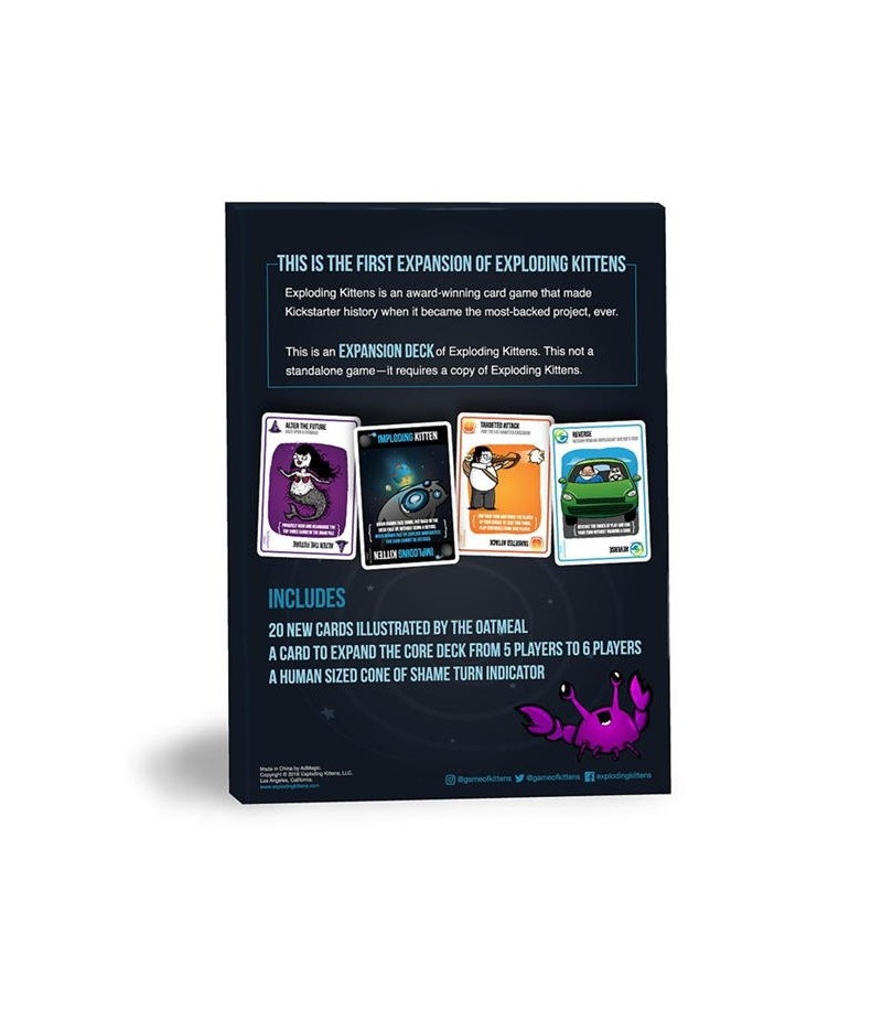 Imploding Kittens este prima extensie a jocului Exploding Kittens, jocul de carti super-premiat care a facut istorie pe Kickstarter, fiind cel mai sustinut proiect din platforma. Aceasta extensie include 20 de carti cu 6 tipuri noi de actiuni si o Pisicuta care face implozie, jocul putand creste astfel de la 5 la 6 jucatori.