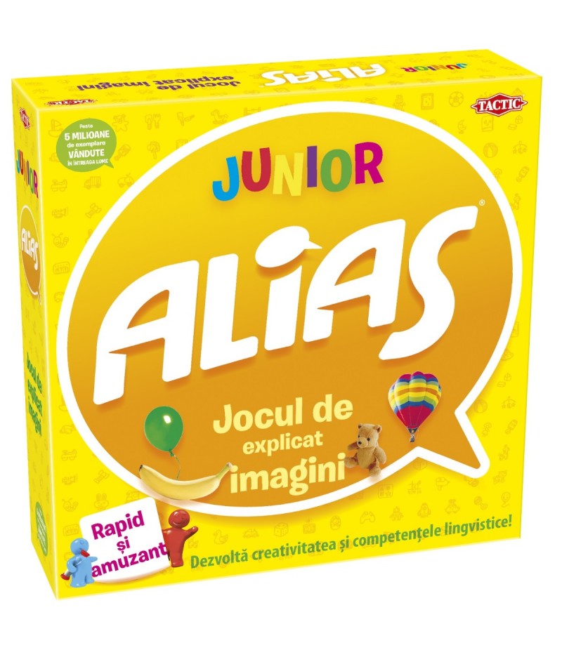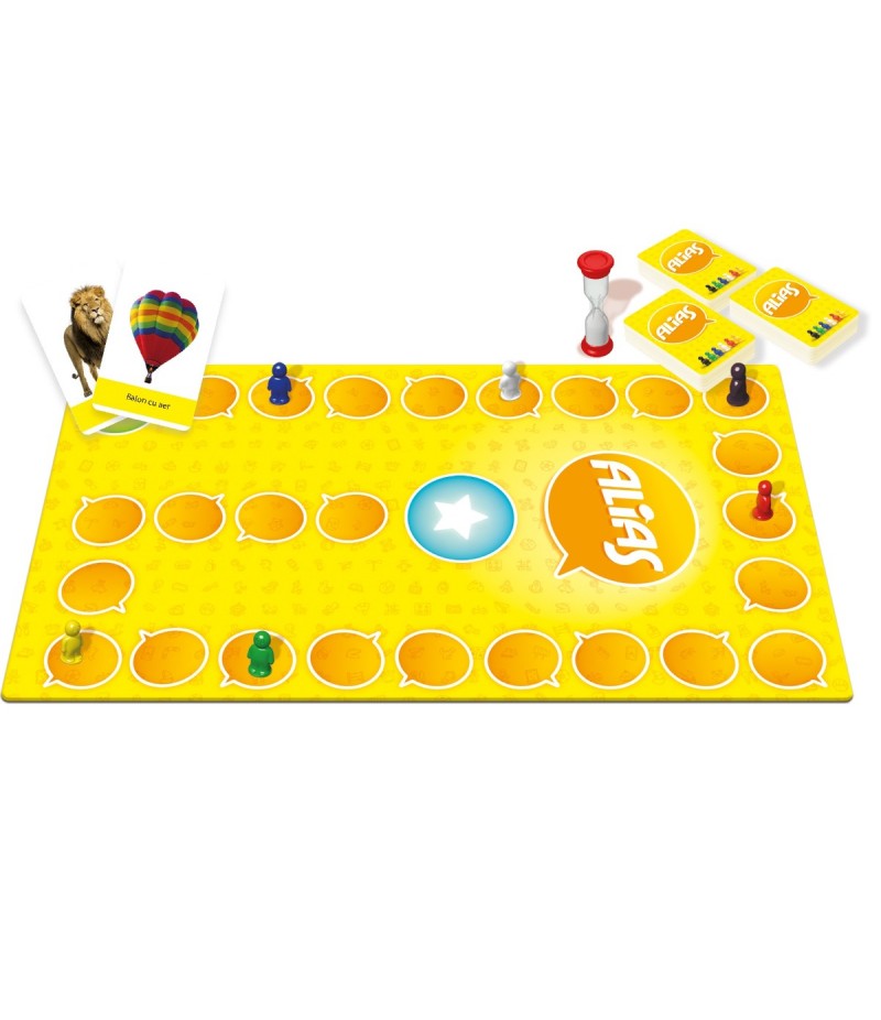ALIAS Junior se poate juca in 2 sau mai multi jucatori. Scopul acestui joc este de a explica celorlalti jucatori din echipa ta cuvinte si pictograme, dar fara a spune direct cuvantul scris pe cartonase. Se pot folosi sinonime, antonime, indicii, sunete etc. Fiecare echipa trebuie sa ghiceasca cat mai multe cuvinte posibile, inainte ca timpul din clepsidra sa se scurga. Echipa poate apoi sa inainteze pe tabla de joc cu un numar de pasi echivalent cu numarul de cuvinte ghicite. Prima echipa care ajunge la linia de sosire este declarata castigatoare. Varsta 5+