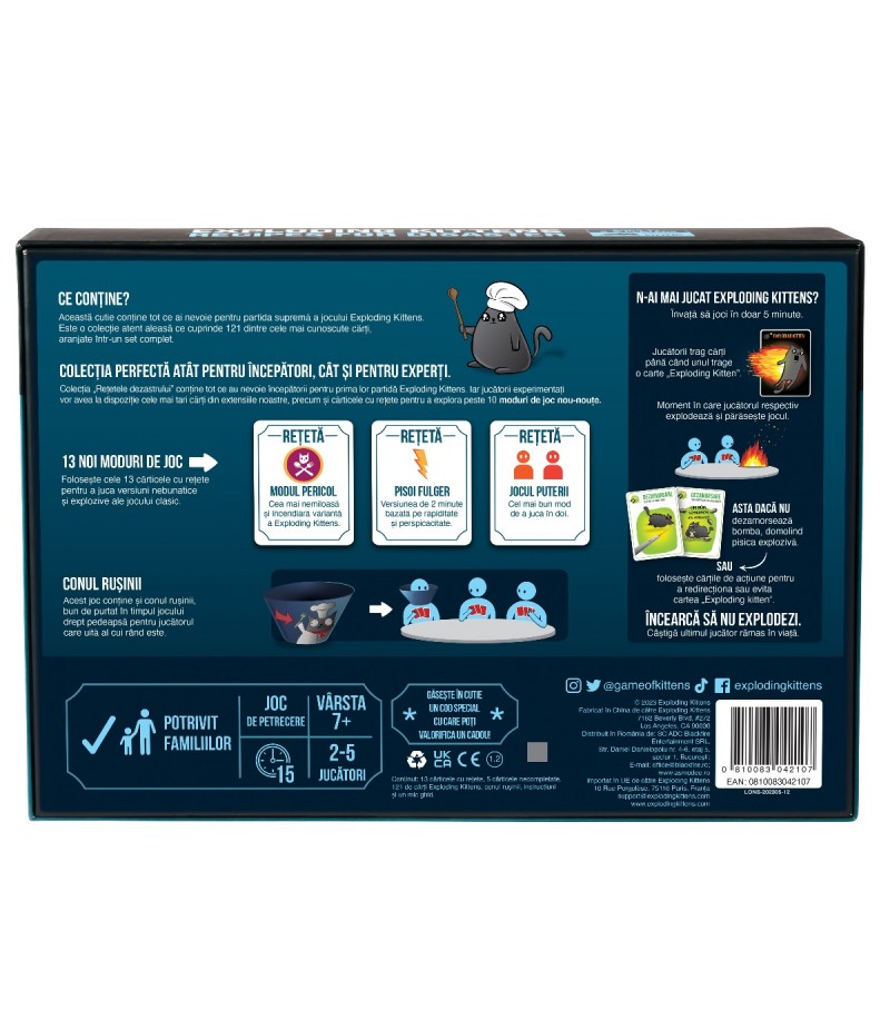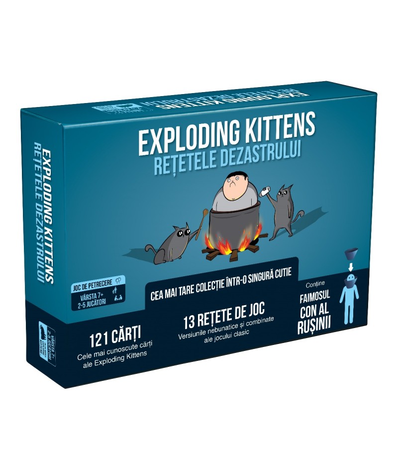 Retetele Dezastrului introduce modalitati complet noi de a juca Exploding Kittens. Include un pachet de 121 dintre cartile noastre preferate din toate jocurile Exploding Kittens si toate expansiunile sale, plus o noua interpretare a iubitului Cone of Shame. Folositi pachetul pentru a asambla cele 13 brosuri de retete incluse si pentru a debloca noi moduri de joc, cum ar fi versiunea jocului cu ONLY Imploding Kittens sau un joc fulger rapid de 2 minute. Cutia include, de asemenea, 5 brosuri de retete goale, astfel incat sa va puteti crea propria experienta de joc. 2-5 jucatori. Varsta 7+