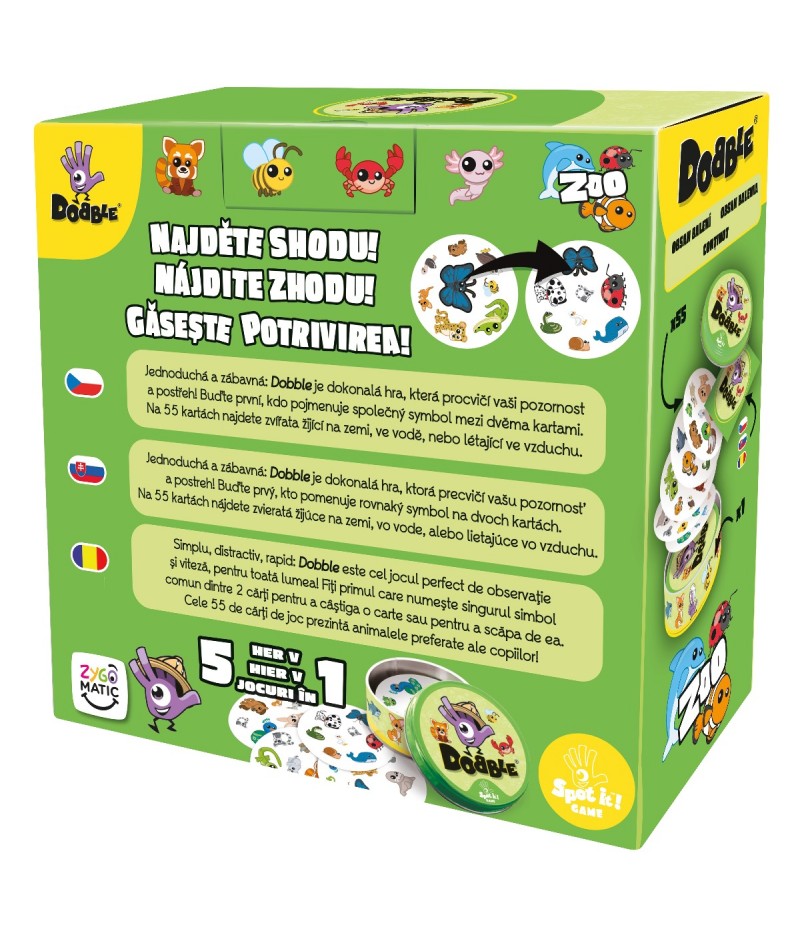 Dobble este un joc de observare rapida, in care jucatorii se intrec pentru a descoperi primii simbolul identic intre un card si altul. Setul contine 55 de carduri de joc de forma rotunda, iar fiecare card are desenate opt animale care variaza de la un card la altul. Oricare doua carduri au un animal comun. Fiecare card este unic si are doar un singur animal in comun cu oricare alt card din pachet. Animalul comun poate fi greu de observat, deoarece dimensiunea si pozitionarea simbolurilor poate varia pe fiecare card. Bazandu-se pe o vedere agera si pe reflexe rapide, jocul Dobble Animals ii va captiva atat pe copii cat si pe parinti. Jocul dezvolta: perceptia vizuala, spiritul de observatie , viteza de reactie, gandirea, atentia si concentrarea. Cardurile vin intr-o frumoasa cutie rotunda de metal pentru depozitare, de dimensiuni potrivite, ceea ce face ca jocul sa fie ideal pentru luat in calatorii. Varsta recomandata: 6+ani Numar jucatori: 2-8 Durata jocului: 15 minute.