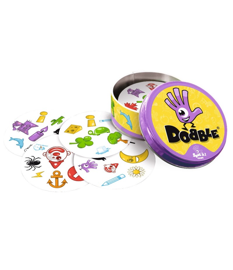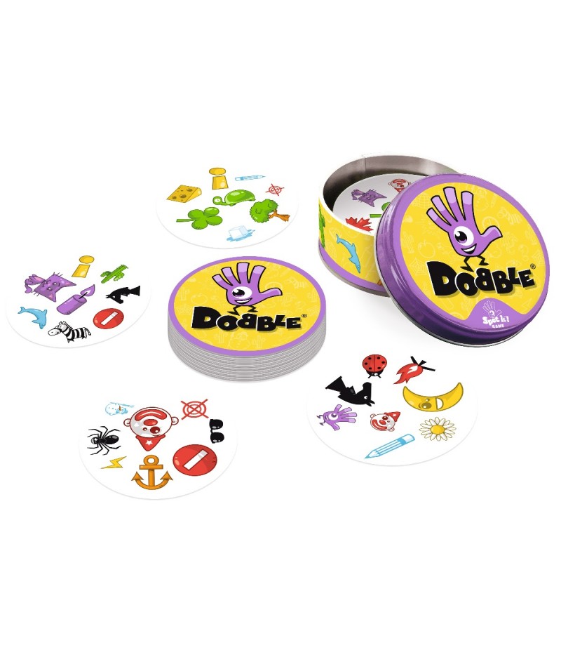 Pe locuri, fiti gata... start! Fii primul care gaseste simbolul comun intre 2 carti. Dobbles este un joc de perspicacitate in care fiecare jucator se va stradui sa fie mereu cel mai rapid in identificarea simbolului comun. Fiecare carte de joc prezinta 8 simboluri. Oricare 2 carti au un simbol grafic comun. Dobble contine o serie de 5 mini-jocuri de rapiditate in care toti jucatorii joaca in acelasi timp. Indiferent de joc, trebuie mereu sa fii primul care gaseste simbolul identic intre doua carti, il numeste si apoi ia cartea si o aseaza sau o decarteaza, in functie de regulile jocului jucat. Setul contine: 50 buc carti de joc de forma rotunda, 5 carti cu variante de joc, regulament de joc. Numar de jucatori: 2 - 8. Durata jocului: 15 minute.