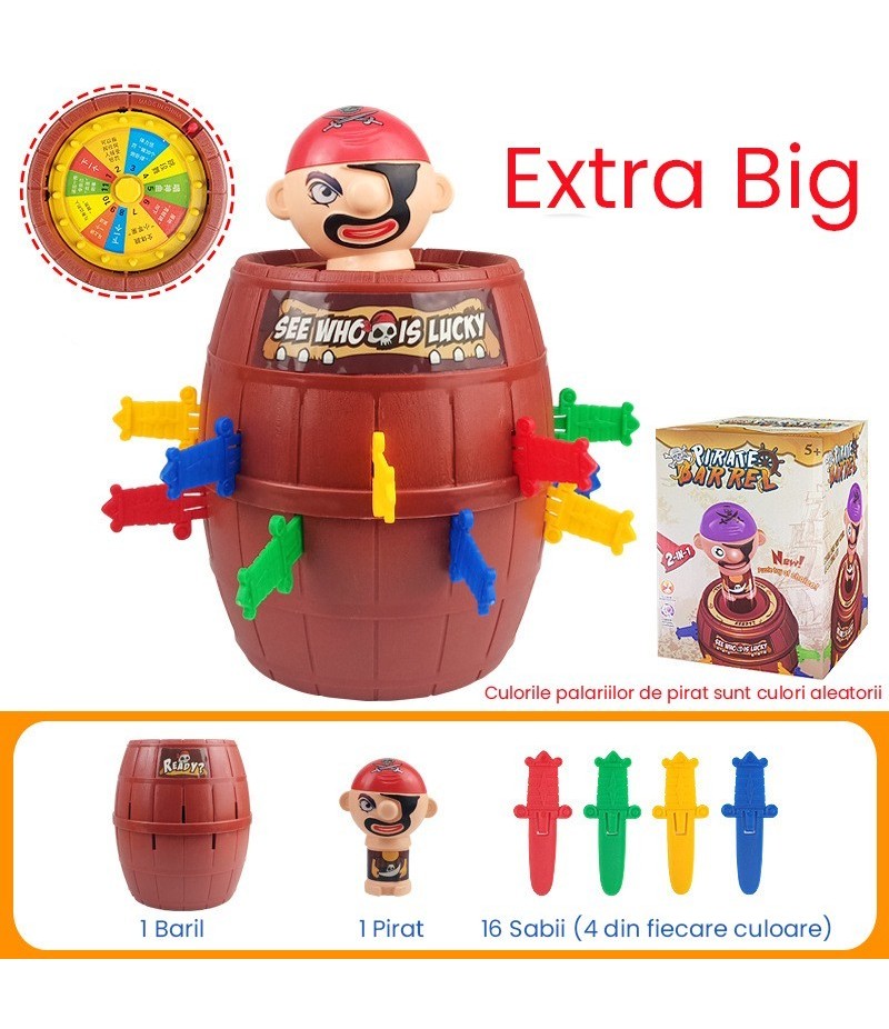 Introdu sabiile in butoias si ai grija - una dintre ele poate arunca Piratul! Cand este infipta sabie corecta, piratul brusc va fi aruncat. Jocul incurajeaza interactiunea, atentia si spiritul competitiv, fiind ideal pentru jocuri de grup.
