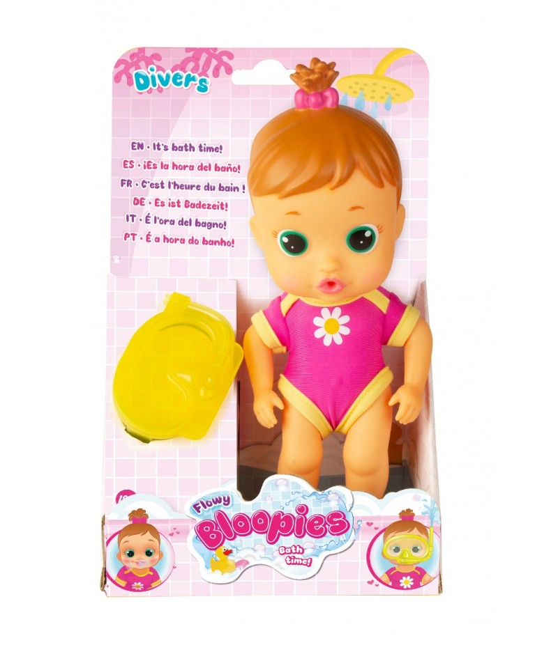 Descopera-i pe Flowy, Sweety, Luna, Lovely si Max, cei 4 bebelusi Bloopies carora le place foarte mult sa se distreze in apa! Fiecare pachet din colectia Bloopies contine 1 papusa Bloopies 1 pereche ochelari de scafandru si un costum de baie! Apasa-i pe burtica si vor face baloane sau vor scuipa apa! Varsta 18M+