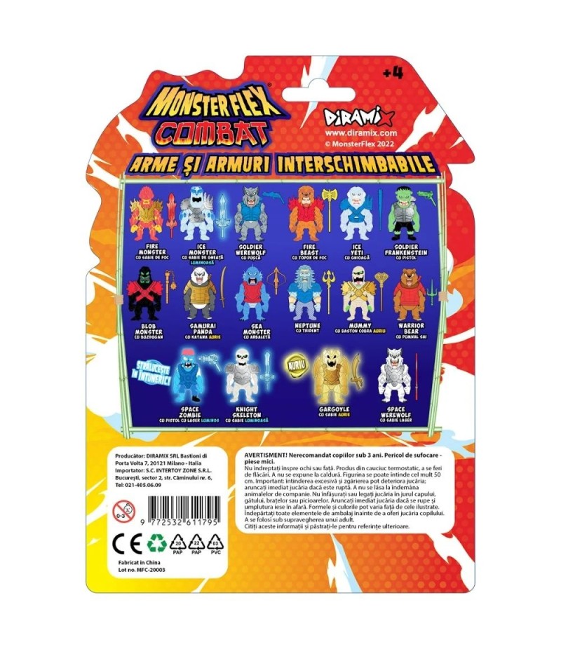 Colectioneaza toate cele 16 modele din colectia Combat: Gargoyle, Ice Monster, Blob Monster, Fire Beast, Fire Monster, Ice Yeti, Knight Skeleton, Mummy, Neptune, Samurai Panda, Sea Monster, Soldier Frankenstein, Soldier Werewolf, Space Werewolf, Space Zombie, Warrior Bear.