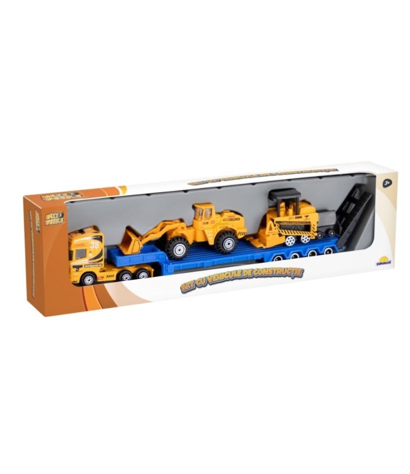 Atat camionul transportator, special proiectat pentru a transporta doua vehicule de constructie, cat si buldozerul si tractorul sunt realizate din metal si detalii din plastic. Transportatorul are caracteristici realiste, cum ar fi rampa pentru incarcarea si descarcarea usoara a vehiculelor.