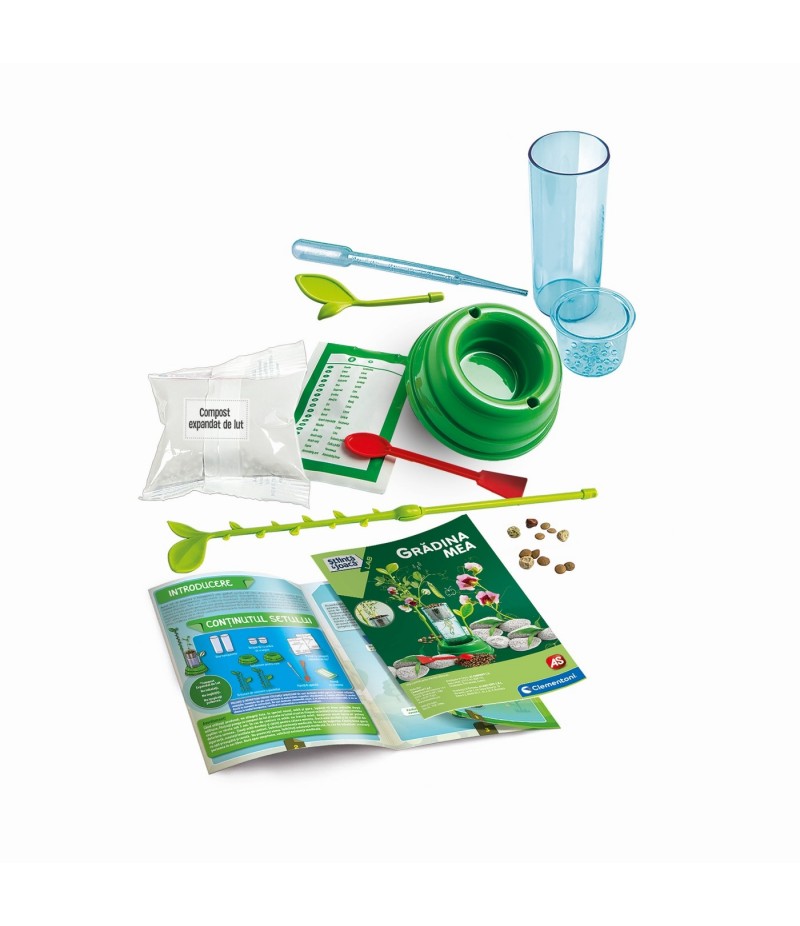Setul contine: vase transparente, recipiente cu orificii de scurgere, farfurioare pentru vasele transparente, punga cu compost de lut, betisoare de sustinere, pipeta, spatula, punga cu seminte si un manual de instructiuni bogat ilustrat, pentru a ajuta copiii in realizarea celor mai fascinante experimente si a cultiva plantele fara sol!